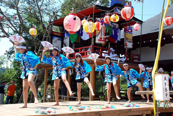 初日に大世話人の指揮のもと、松原寺境内に天棚を組み立てます。翌日は行人が水垢離(みずごり)をとり、神官・僧・行人が天棚に登り祈りをささげます。その後、お囃子のリズムに乗り法被姿の子供たちが舞台に登場します。太鼓や笛に合わせ、「綾竹踊り」や「扇子踊り」をダイナミックに披露します。天棚上の祭り(神送り)の後、太鼓場で太鼓打ちの奉打(ほうだ)(ぶっきり)があり、翌週には天棚が壊されて祭りが終わります。