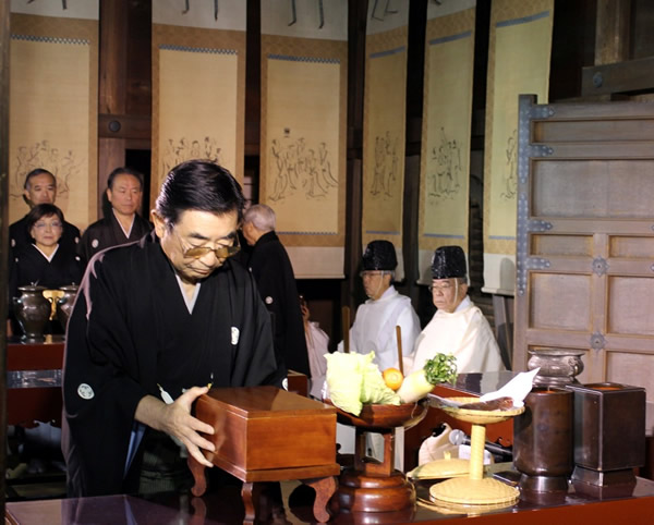 約150 名の参列者は杏壇門(きょうだんもん)の前で手を洗い、口をすすぐ禊(みそぎ)を済ませ、孔子廟に入場します。会場に鐘の音が響き儀式が始まり、神官が祝詞(のりと)を読み上げます。参列者は雅楽が流れる中、孔子像と足利学校を創設したと伝えられる小野篁(おののたかむら)公像に肉や魚、野菜などを供えます。
