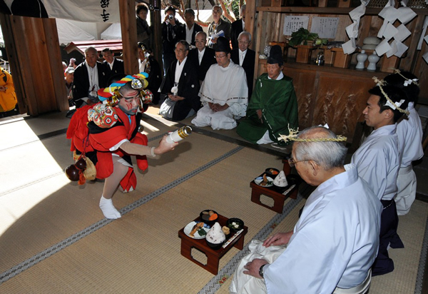 神事は3種類ある。まず村で採れる里芋を氏子等におもしろ可笑しく口上を述べながら食べさせる「おはんじきあないもん」。木馬で殿内を駆け回る「春駒式」。