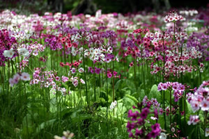 クリンソウはサクラソウ科の多年草で、茎を取り囲んで何段にも重なるように花が咲くことから、五重塔などの先端部分(九輪)にたとえて名前が付けられました。千手ヶ浜の約2万平方メートルに白やピンクの可憐な花が咲きます。外山沢川周辺では濃い赤の花、柳沢川南側では白花が多く、それらが交配して花の色に変化があるのが特徴です。